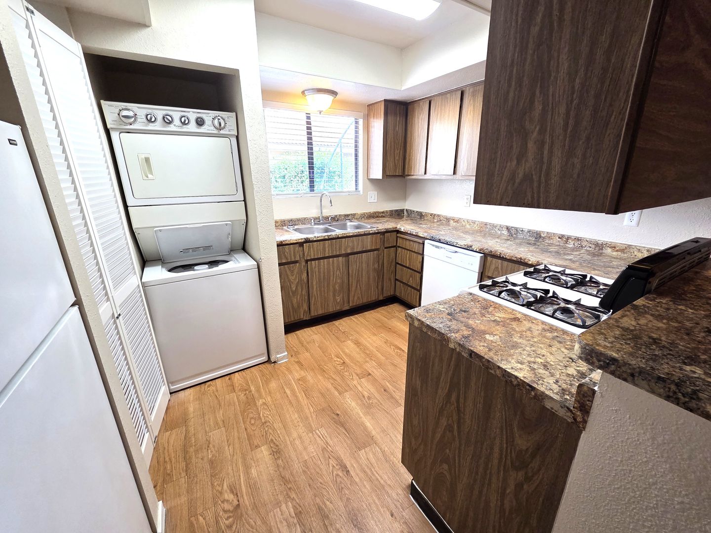 This 2 bedroom 2 bath apartment home features vinyl and new carpet flooring throughout with a spacious living, dining and kitchen area. Stove, refrigerator, dishwasher and washer/dryer is included. Central A/C & heating, Fireplace, fenced court yard, covered parking, private storage, and an enclosed in-ground pool in a beautiful park-like setting in a great part of town close to schools and well as shopping and restaurants.